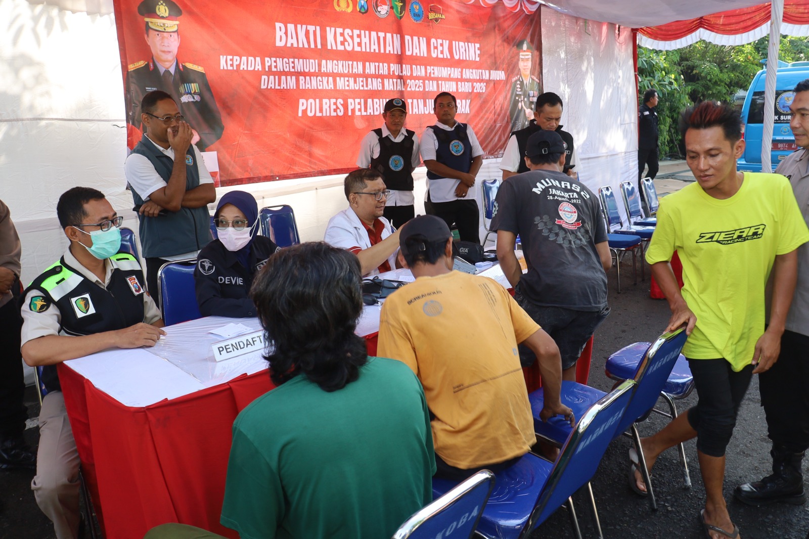 Pada Jumat (12/12/2025), aparat kepolisian berkolaborasi dengan BNNK Surabaya menggelar kegiatan Bakti Kesehatan dan Tes Urine bagi para pengemudi angkutan umum, angkutan antar pulau, serta ojek online (Ojol) yang melintas di kawasan Gate Pelabuhan Jamrud, Jalan Perak Timur.